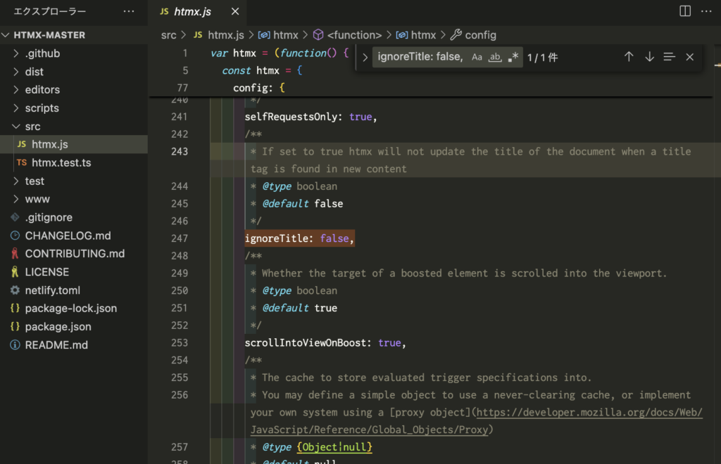 src/htmx.jsファイルを開きます。 ignoreTitle: false,の部分をignoreTitle: true,に変更します。