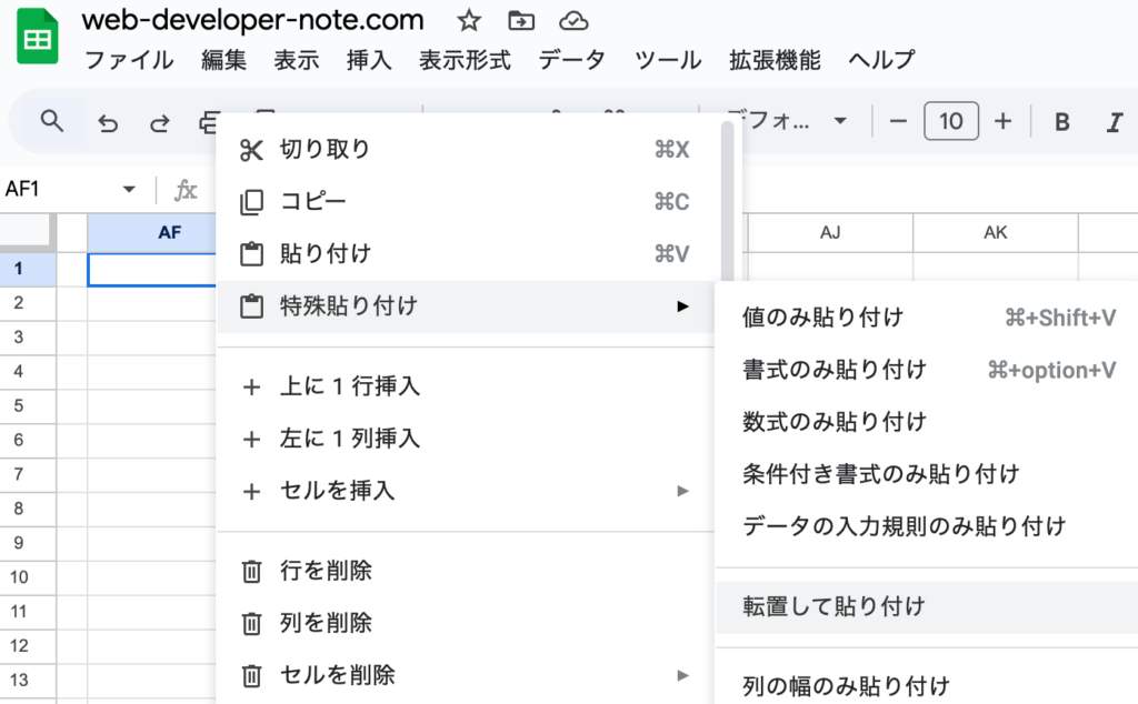 展開されたデータは、SPLIT関数によって動的に生成されるため、必要に応じて値として固定する必要があります。以下の手順で値貼り付けと転置を行うことができます。